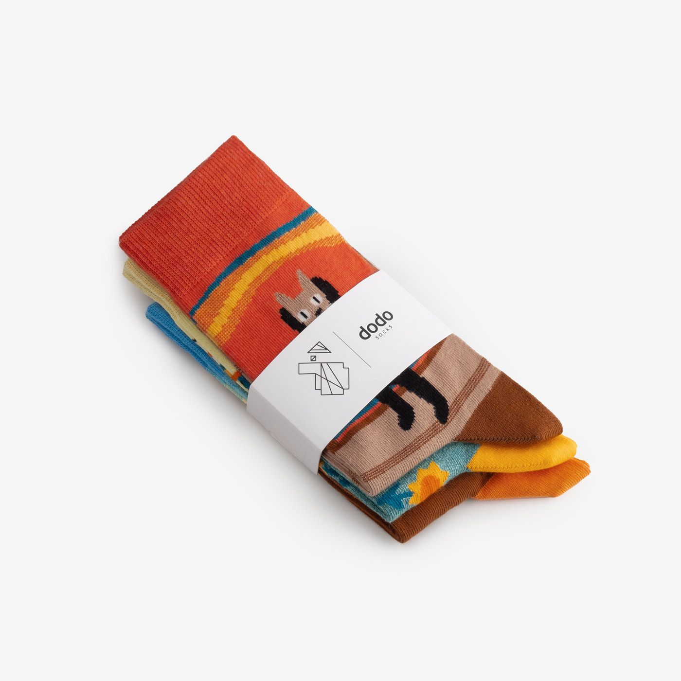 A set of three pairs of socks featuring illustrations of charismatic cats on the masterpieces of world-renowned artists: Edvard Munch, Vincent van Gogh, and Salvador Dalí.