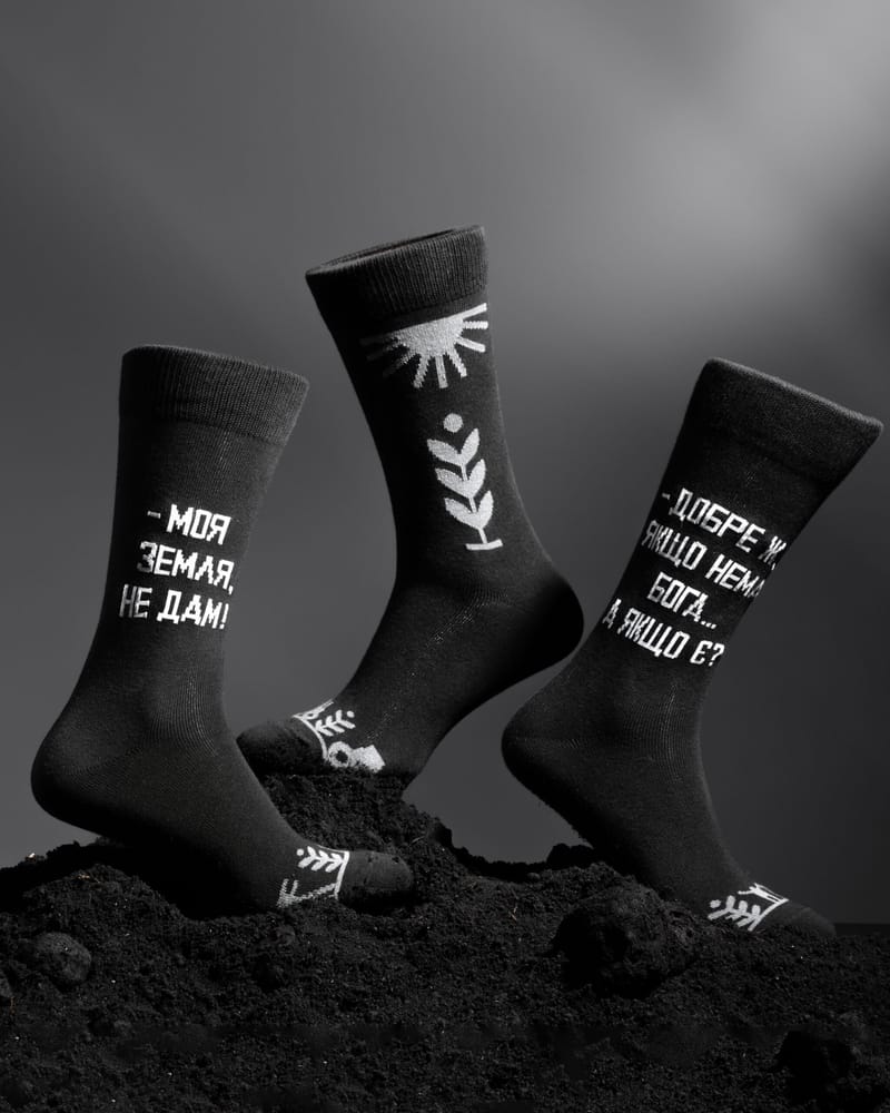 The «Earth» collection aims to honor one of the most outstanding works of world cinema. The unique aesthetics of the film served as inspiration for creating three mismatched socks that can be combined in any format. Each sock is adorned with a quote from the film on one side and a symbolic ornament on the other.