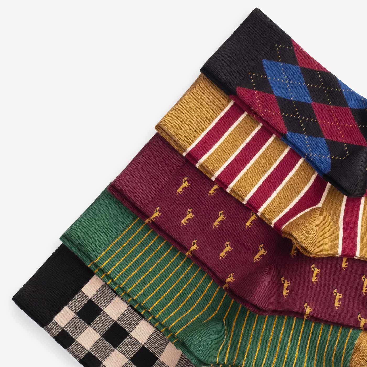 This set returns refreshed to remind you: “classic” doesn’t mean “boring.” Checks, stripes, argyle, and a whole pack of little dogs — all together create the vibe of a university campus, where academic elegance meets bold accents. Five pairs of socks for those who love sophistication but aren’t afraid to experiment.