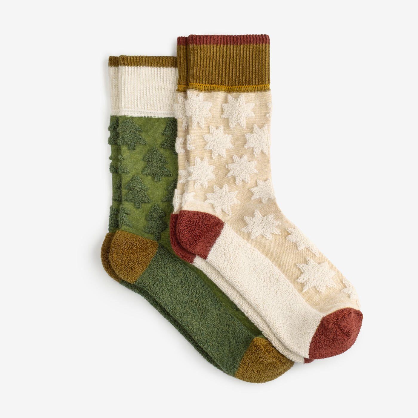 A set of socks with a soft, cozy print and a warm terry exterior on the footbed.