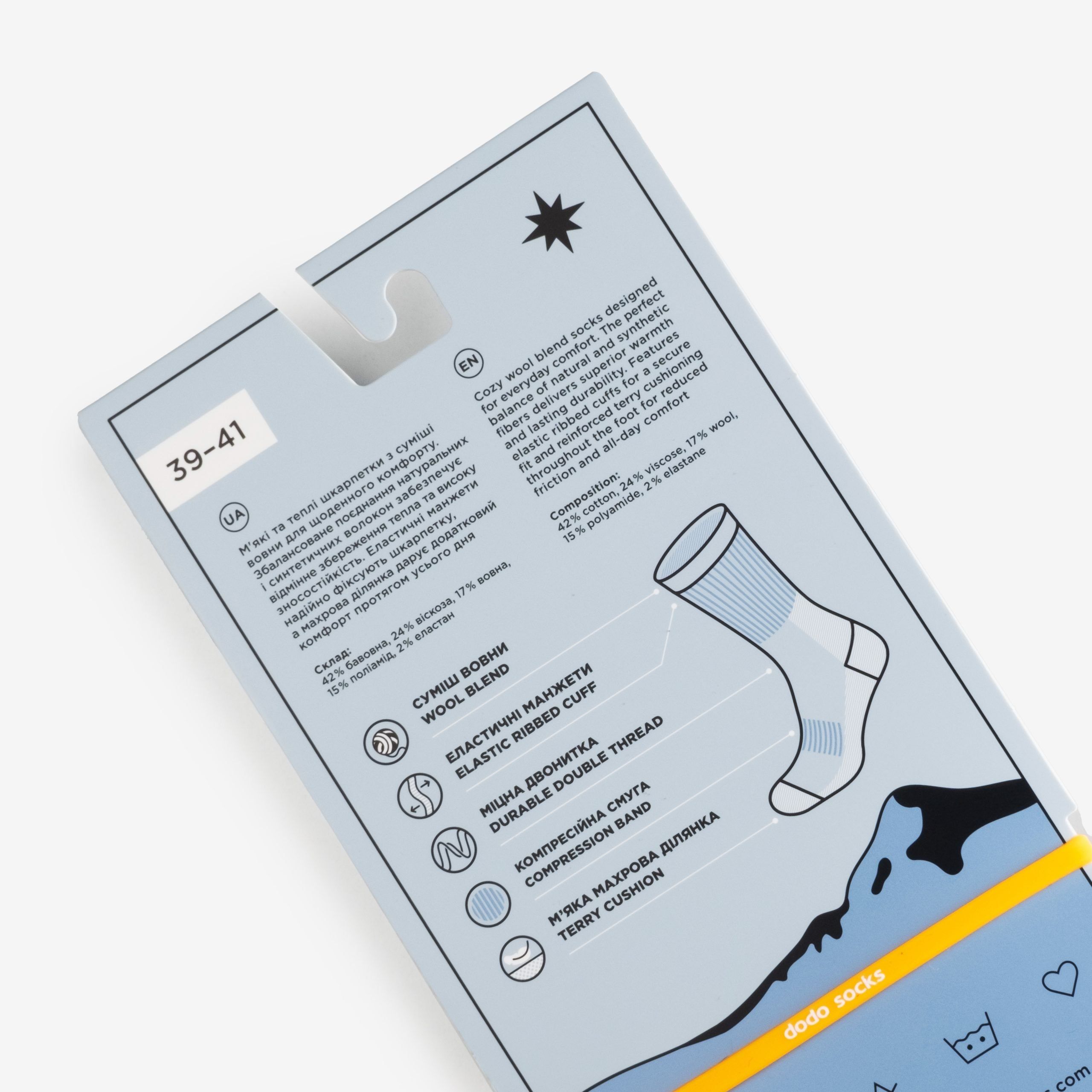 Ми використовуємо високоякісну суміш вовни, бавовни та синтетики, яка забезпечує оптимальне збереження тепла, зносостійкість і комфорт. Міцна двонитка витримує інтенсивне носіння, а еластичні манжети тримають шкарпетку на місці без надмірного тиску.