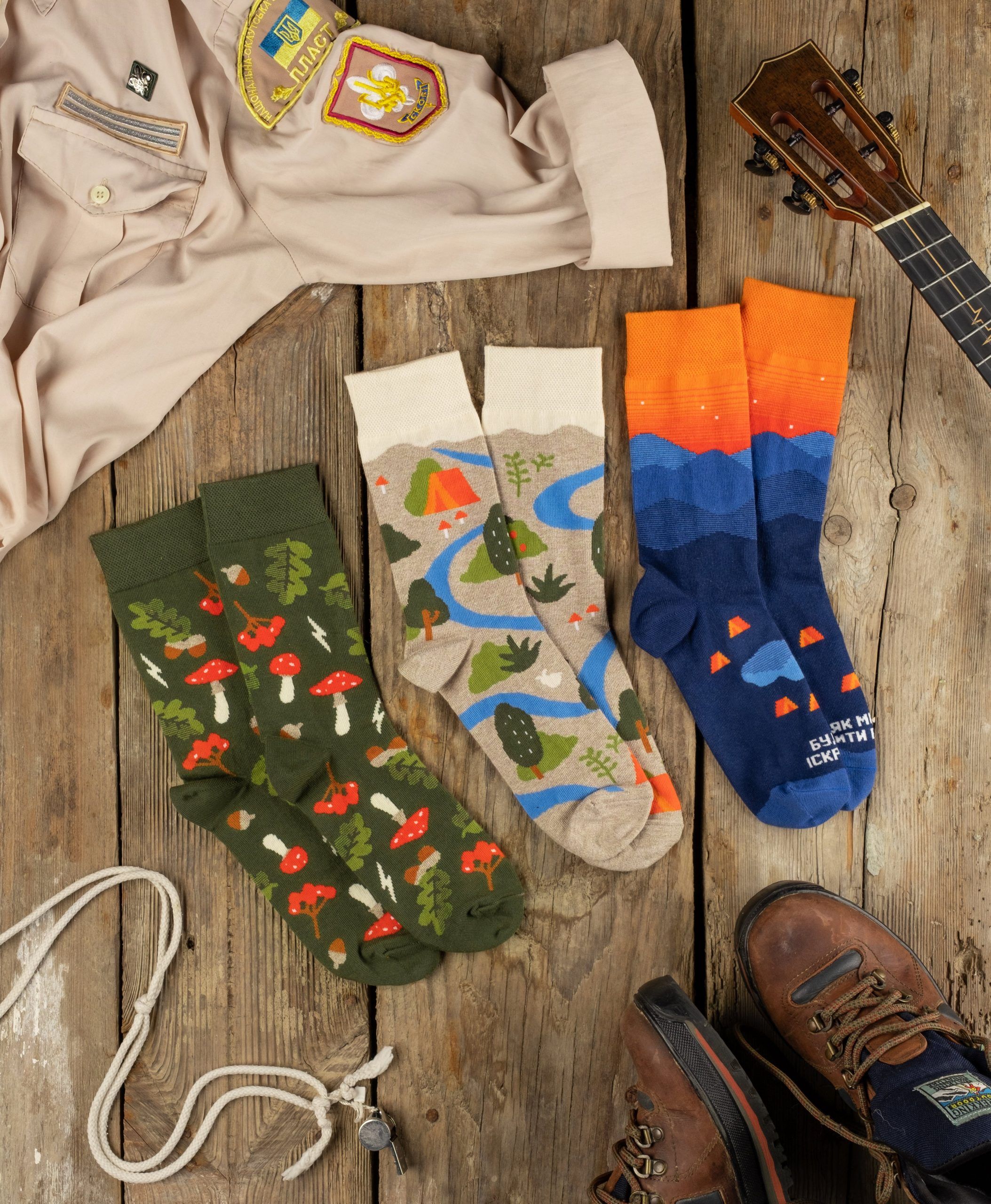 У співпраці з Пластом ми створили набір шкарпеток, який передає дух пластунського життя з його символікою (СКОБ) та таборовим побутом.