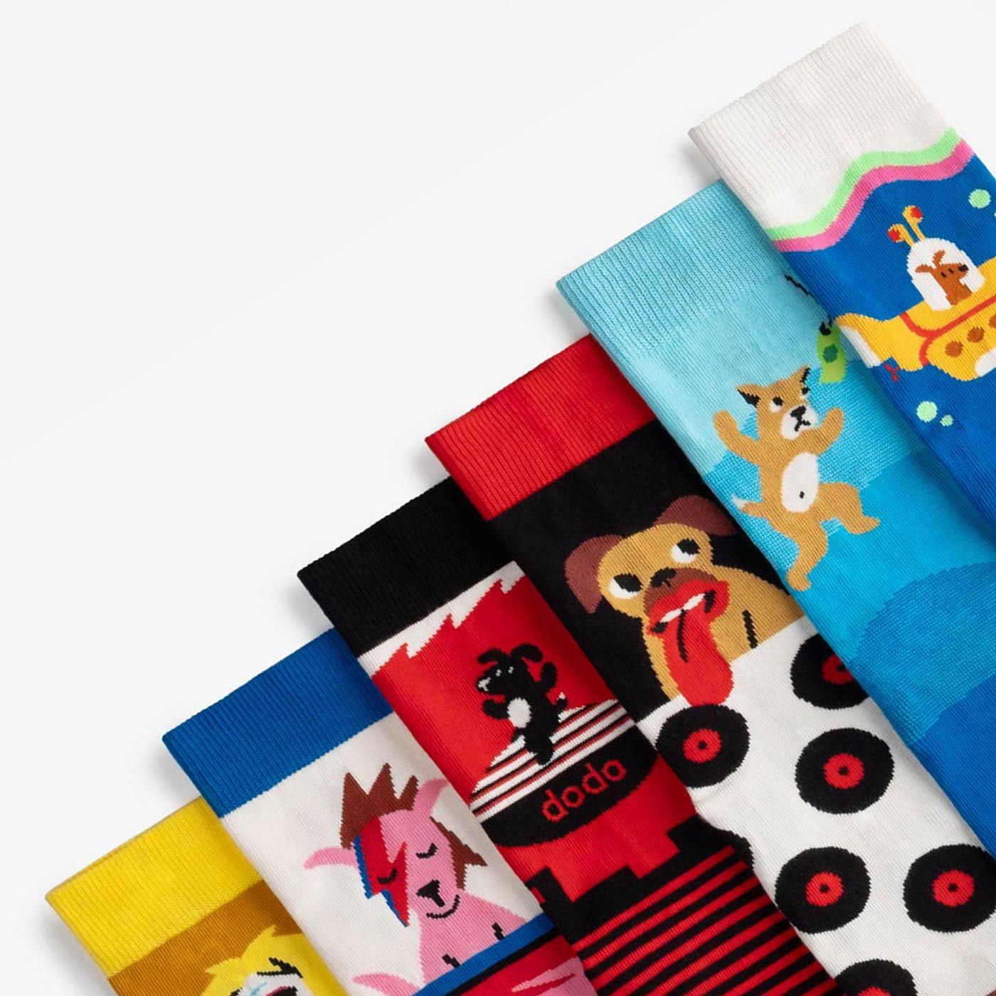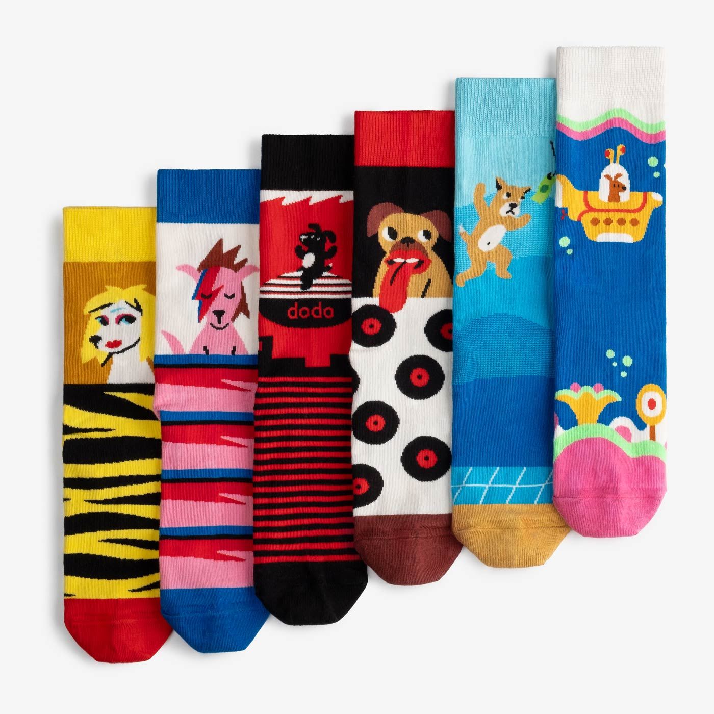 Набір з 6 непарних шкарпеток з ілюстраціями рок-н-рольних собак, натхненними культовими обкладинками альбомів The Beatles, Led Zeppelin… та ви ж їх усі й так впізнали, чи не так?