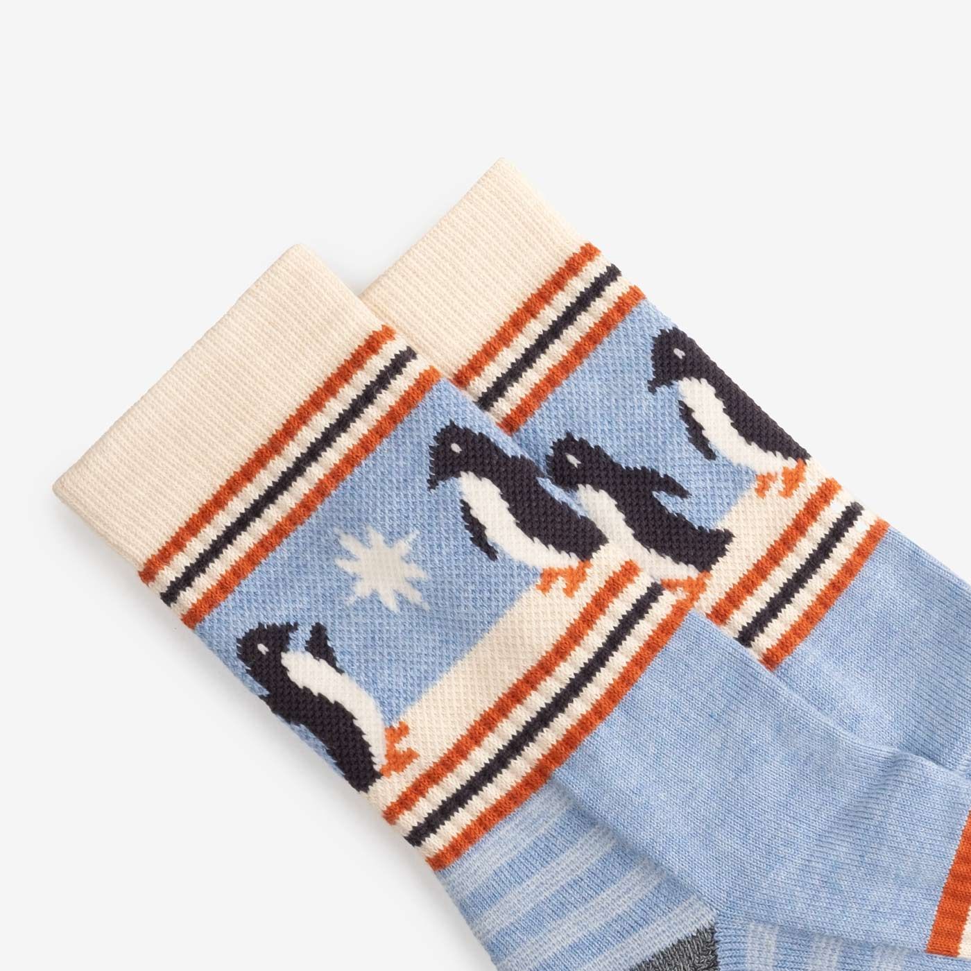 Хто точно знається на довгих мандрівках снігом, то це пінгвіни. Біля станції “Академік Вернадський” мешкає ціла колонія цих дивовижних птахів. Саме вони надихнули нас на ці трекінгові шкарпетки: витривалі, теплі та до краю милі. Мериносова вовна регулює тепло, бавовна Pima додає мʼякості, а синтетика швидко сохне і підвищує зносостійкість. Завдяки високій резинці шкарпетки не сповзають і не тиснуть. Гладкий і непомітний кетельний шов захищає від натирань. Усередині — м’яка махра, яка робить кожен крок легким.